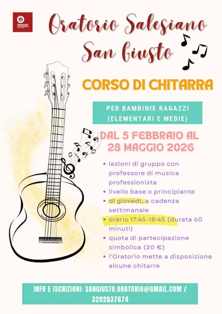 All’Oratorio Salesiano San Giusto parte un nuovo corso di chitarra pensato per bambini e ragazzi delle scuole elementari e medie che desiderano avvicinarsi al mondo della musica in modo semplice e coinvolgente. Il corso si svolgerà dal 5 febbraio al 28 maggio 2026, con lezioni settimanali il giovedì dalle 17:45 alle 18:45, in piccoli gruppi